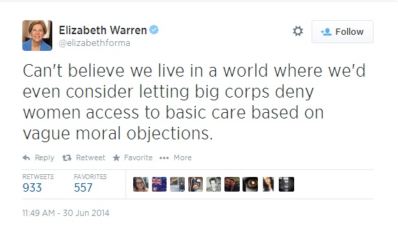 Elizabeth Warren already infamous for creating the Obama Doctrine of “You didn’t build that” tweets the liberal lie that Hobby Lobby is denying women healthcare and contraception due to their “vague moral objections” of Christianity