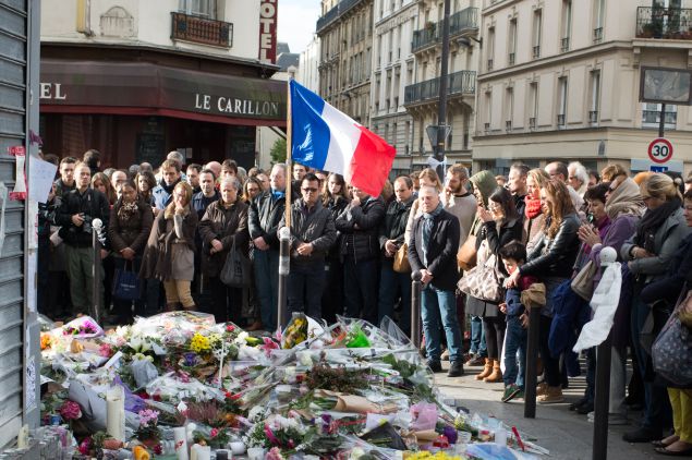 PARIS, FRANCE – NOVEMBER 16: People gather to observe a minute silence outside the Le Carillon restaurant in memory of the victims of the Paris terror attacks last Friday, on November 16, 2015 in Paris, France. Countries across Europe joined France, currently observing three days of national mourning, in a one minute-silence today in an expression of solidarity with the victims of the terrorist attacks, which left at least 129 people dead and hundreds more injured. (Photo by Thierry Orban/Getty Images)