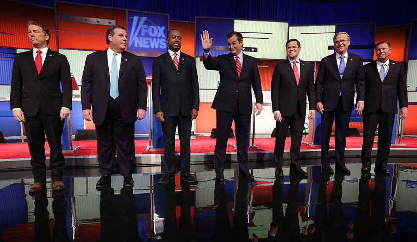 DES MOINES, IA – JANUARY 28: Republican presidential candidates (R-L) Ohio Governor John Kasich, Jeb Bush, Sen. Marco Rubio (R-FL), Sen. Ted Cruz (R-TX), Ben Carson, New Jersey Governor Chris Christie and Sen. Rand Paul (R-KY) pose for photographers prior to the Fox News – Google GOP Debate January 28, 2016 at the Iowa Events Center in Des Moines, Iowa. Residents of Iowa will vote for the Republican nominee at the caucuses on February 1. Donald Trump, who is leading most polls in the state, decided not to participate in the debate. (Photo by Alex Wong/Getty Images)