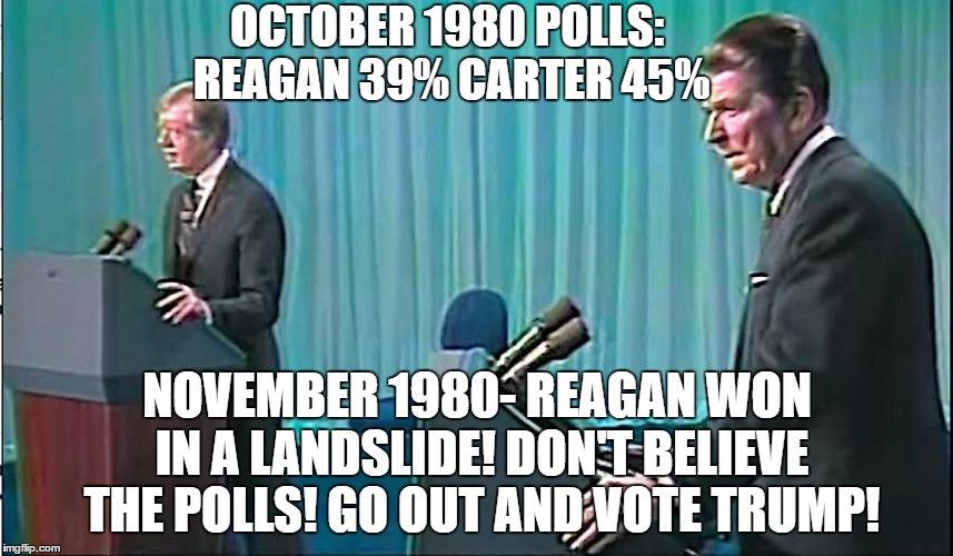 Polls currently show Trump losing big, but they did the same to Reagan in 1980.  The leftwing media is the propaganda arm of the Democrat Party and they want to demoralize Republicans from voting.  Unlike McCain and Romney, Trump is on the attack against liberal media lies.  The leftist media will not tell the truth, but now smear Trump as “hating the polls he used to love.”  What’s to love about Democrat lies when they weight polls so they show Hillary winning?
