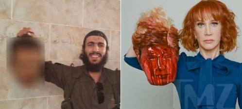 Kathy Griffin is a comedienne and she’s sooooo funny! Holding a bloody head of President Trump is a joke! LOL! It’s as funny as people posting pictures of Obama being lynched, making movies about Bush being assassinated, and telling jokes about Jews being cooked in ovens. It’s all in good fun. Just a joke. A comedian making a funny.