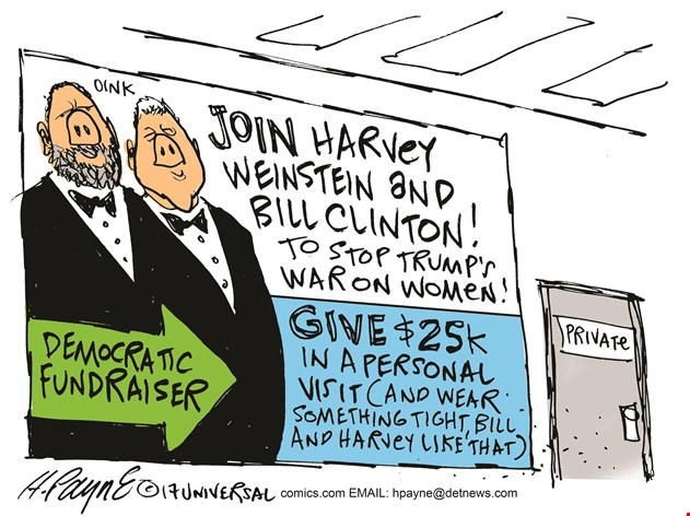 The dysfunctional Left, in their cognitive dissonance of damning all men as rapists, are incensed that Weinstein, a rabid Hollywood liberal and serial molester, is being brought down after being exposed as a rapist, while Donald Trump, whom they exposed as being guilty of man talking smack about women, was not. Ever since the leftist mainstream media failed to torpedo Trump with their Access Hollywood tape, leftists have been twisted in fits of rage over his victory against Hillary who is the wife of another serial molester who used his power to coerce, grope, and even rape women while she crushed them if they complained. When women came out and confessed that Trump has always behaved as a gentleman, the Democrat smear campaign, that included some bow-wows hired as leftist operatives to make false accusations, all fell on its face in the mud from which it was drawn, and Hillary’s lie that Trump admitted to being a sexual predator rings as hollow today as her claims that her husband’s crimes have been litigated when everyone knows she humiliated those women. Now that they’ve finally confessed to Weinstein’s crimes against women they believe they can somehow paint Trump with the same brush. But Weinstein has far more in common with Bill Clinton.