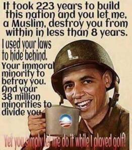 Overseas Obama’s funding gave power to Iran and the Muslim Brotherhood to foment rebellions against governments that kept jihadis in check.  With his aid ISIS was born to almost overthrow Iraq and reverse President Bush’s victory.  His faux bombing campaign that enabled ISIS to turn on Syria resulted in Russia getting involved creating a rift between Obama and Putin to whom he had promised to disarm America’s nuclear arsenal.  Obama’s brown thumb leftism resulted in European states electing leftist governments who have allowed the Islamic Jihad to invade their countries by importing Moslems to colonize the West.