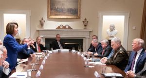 [Author’s Note: Pelosi and her fellow children walk into a meeting with the man they are trying to impeach over their lies to start a fight and they got it! Trump, as the adult in the room, wasn’t going to put up with their snot-nosed actions. Then the children run to the cameras to put on a clown show. Politicians are reasonable? Democrats are respectful? Pelosi says she’s praying for Trump’s health. Don’t make me laugh! No doubt for his dynamic health to fail. There’s nothing Christian about her. Trump should give them the LBJ treatment and call them into a meeting in the bathroom while he’s taking a smelly dump!]