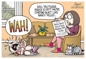 [Author’s Note: Pelosi and her fellow children walk into a meeting with the man they are trying to impeach over their lies to start a fight and they got it! Trump, as the adult in the room, wasn’t going to put up with their snot-nosed actions. Then the children run to the cameras to put on a clown show. Politicians are reasonable? Democrats are respectful? Pelosi says she’s praying for Trump’s health. Don’t make me laugh! No doubt for his dynamic health to fail. There’s nothing Christian about her. Trump should give them the LBJ treatment and call them into a meeting in the bathroom while he’s taking a smelly dump!]