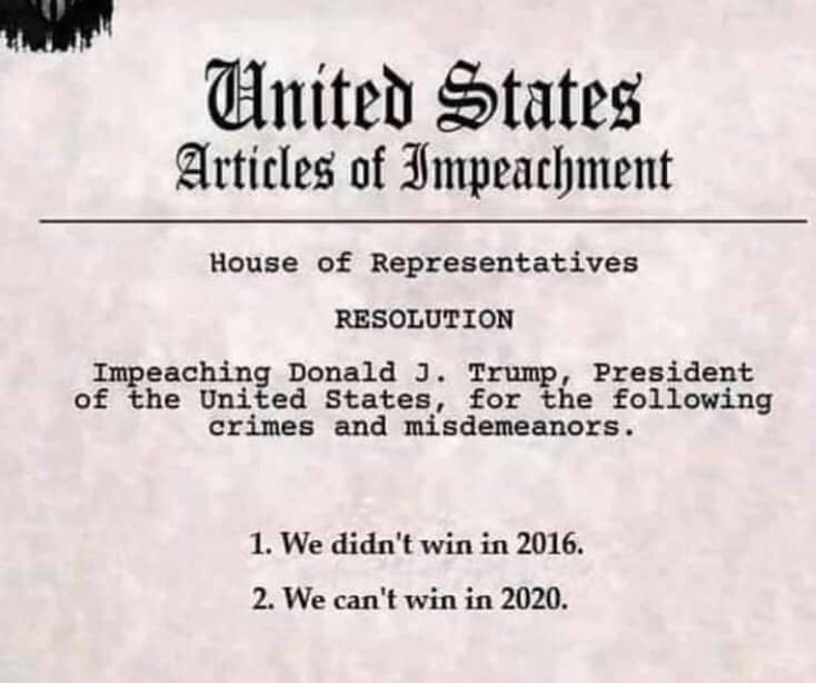 This impeachment that was begun on the frauds of Russian collusion interfering in the 2016 election, and now has been reinstated on the fraud of the Ukraine phone call, has devolved into simply Democrats slandering Trump for not obeying their will. They tell lie upon lie about Trump and his foreign diplomacy because they know he is making America great and they cannot win at the ballot box regardless of how much voter fraud they produce from illegal foreign voters in their deep blue states. Now he needs to go nuclear on their lying asses.