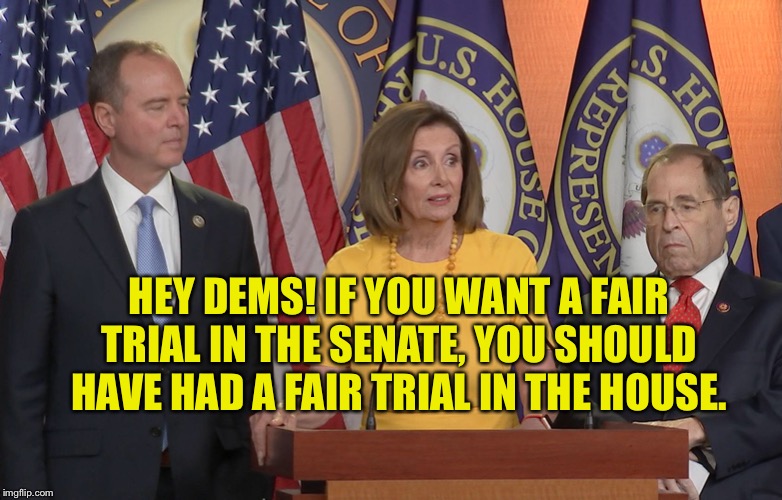 Democrats are showboating in the Senate because they have no case. They falsely accuse Republicans of conducting a coverup, as the same House Democrats who conducted a coverup of their impeachment proceedings against President Trump in Schiff’s basement Star Chamber, for refusing to submit to their demands. Senate Majority Leader McConnell (R-KY) declared that this impeachment trial will follow the same rules as the Clinton trial. Senate Minority Leader Schumer (D-NY) says that he is lying but cannot cite a single example. So, can you tell which senator is lying? Democrats impeaching Trump for “obstructing Congress” when they conducted their entire impeachment process behind closed doors disallowing any defense by the president. Claiming they are righteous and just is a slap in the face of the people, the Constitution, and Lady Justice. Why should Republicans allow Democrats to produce more bogus evidence in the Senate while Democrats continue to demand that the President have no defense? Why should