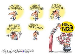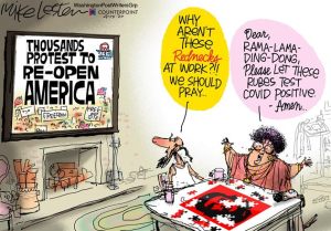 Anyone who doesn’t agree with backwards liberal thinking, doesn’t suffer from Trump Derangement Syndrome, or refuses to give in to Democrat’s demands is a racist conspiracy kook in their minds. This delusion has resulted in many Democrat governors believe they can make dictates as “emergency measures.” A word on protests. As expected, Democrat governors are using the opportunity of this pandemic to impose their socialism on their states. Why shouldn’t they, they think? We are now living under actual socialist rules. The people are forced to obey and suffer, twenty-two million have lost their jobs and told to wait for government aid, while those in government are still getting their paychecks. Let them suffer privations and they wouldn’t last a day.