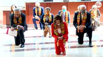(Rambling incoherently about George Floyd and MLK with mask hanging off his ear, Biden appears to be every bit the idiot leftist he has always been.)